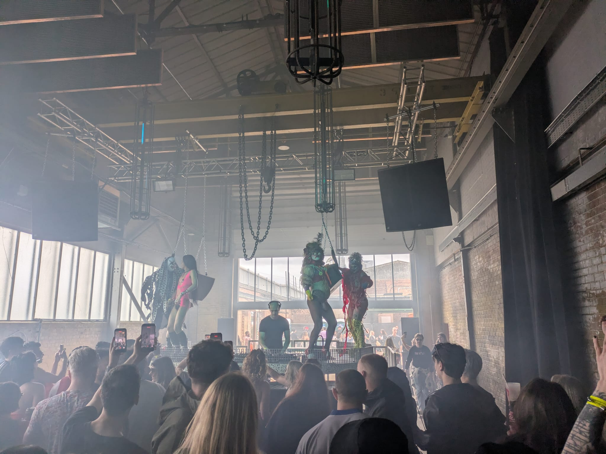 I found one of my friends front right — I know, very off-brand, but it's less packed and infinitely easier to meet someone on a full dancefloor without having to navigate through a river of people already deep in their trance, doing the excuse me, sorry, may I, thanks routine and hoping you don't bump someone out of their flow. We stayed together for a bit, dancing to Philippa Pacho warming up the floor. She was doing it beautifully. After a while we slipped out to the smoking area for a quick catch-up before the music reached the kind of level that makes leaving feel impossible.